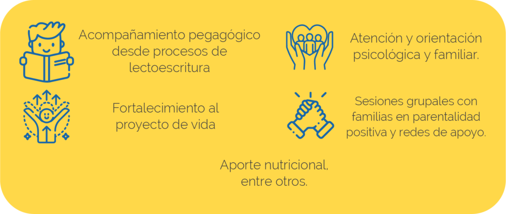 POBLACIÓN DE ATENCIÓN 350 niñas y adolescentes entre 6 y 17 años de edad con proceso administrativo de restablecimiento de derechos. Estamos ubicados en los barrios: Sucre, Lourdes, Vallado y Alfonso Bonilla Aragón de la ciudad de Cali. Fundapre opera el programa de restablecimiento de derechosmodalidad Externado en convenio con el ICBF, en el cual atiendeniños, niñas, adolescentes y a sus familia, pertenecientes acomunidades vulnerables de la ciudad y que, presentansituaciones relacionadas con amenaza y/o vulneración de sus derechos.El programa tiene como objetivo realizar un proceso deintervención y fortalecimiento a la familia desde diferentescomponentes, tales como: